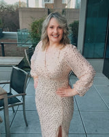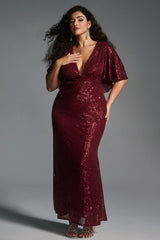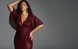 Curveins Plus Size V Neck Sequins Lantern Sleeve Slit Mesh Dress