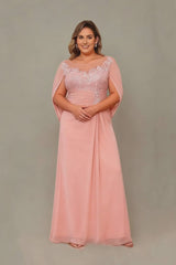 Gracefully designed with a sheer round neckline, delicate lace appliqué, and flowing cape sleeves, this plus size gown blends sophistication with modern elegance. The draped waist enhances your silhouette, while the full-length skirt offers timeless refinement—perfect for galas, weddings, and any formal event where you want to shine effortlessly.