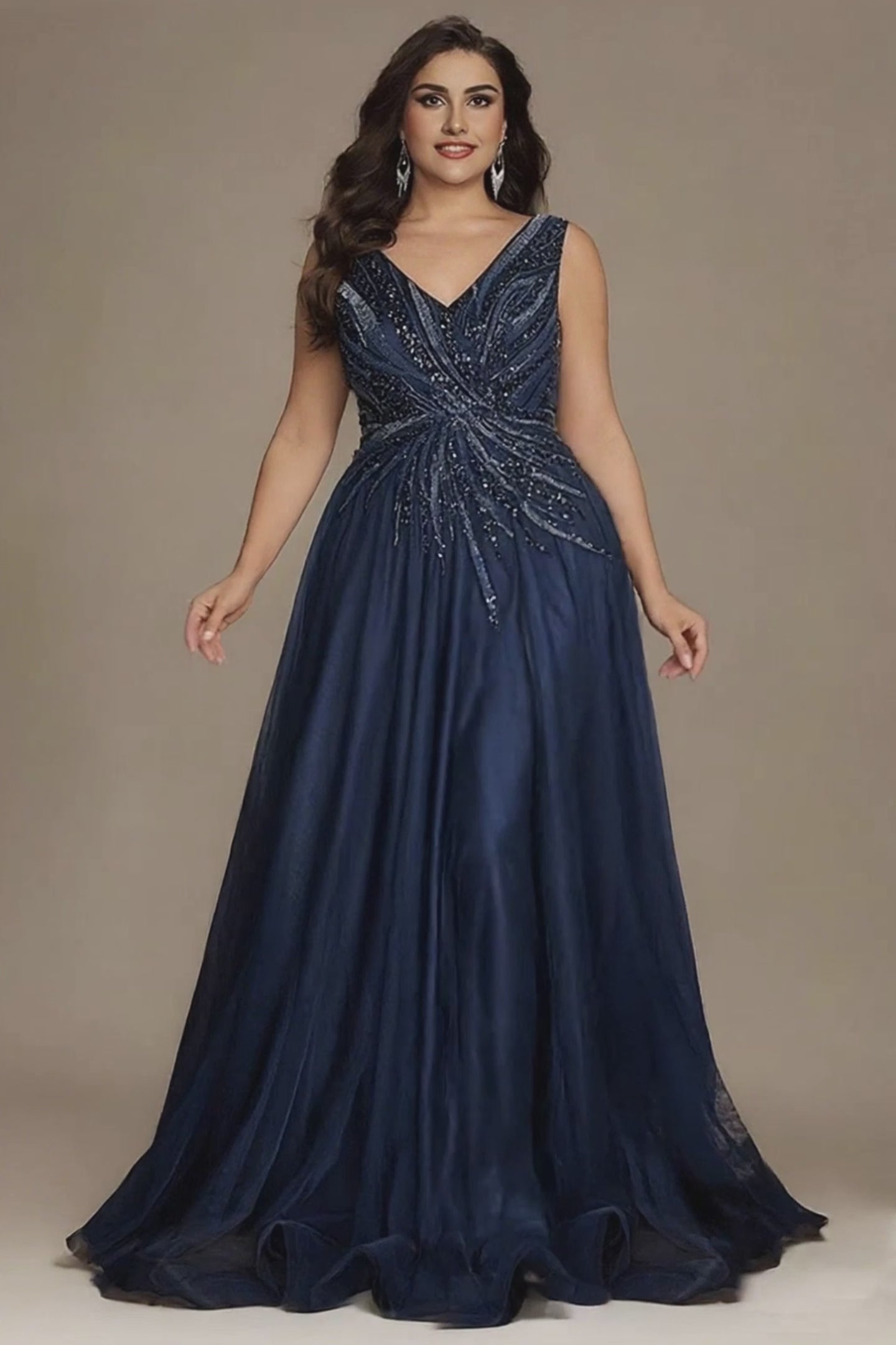 Curveins Elegant Plus Size V-Neck Sleeveless Glitter Pleated Evening Gown