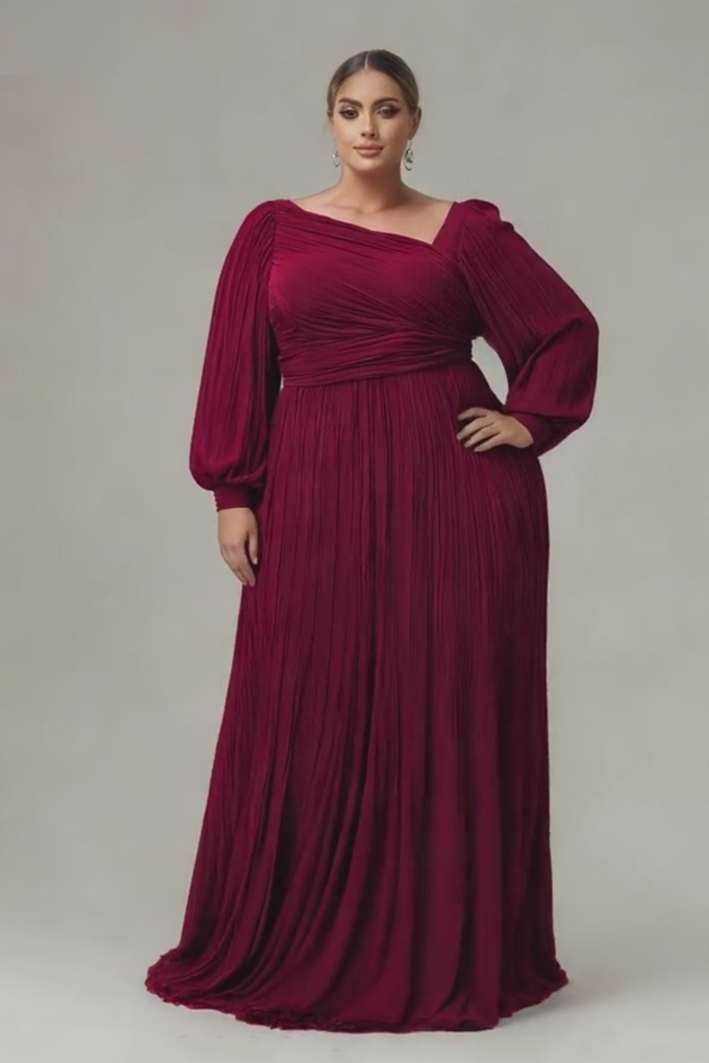 This plus size maxi dress combines a stylish cross-over neckline with elegant lantern sleeves, creating a timeless yet modern silhouette. The cinched waist enhances your curves while offering a comfortable fit. Perfect for dinner dates or evening events — effortlessly elegant, designed to make every woman feel confident and graceful.