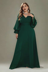 Make an unforgettable entrance in this plus size V-neck gown, featuring elegant lantern sleeves and a beautifully pleated waist that shapes and flatters. The flowing A-line silhouette adds graceful movement and timeless charm. Perfect for formal events, galas, or evening celebrations—effortless elegance designed to elevate every moment.