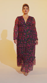 Curveins Plus Size Floral Print Lantern Sleeve Tiered Maxi Dress