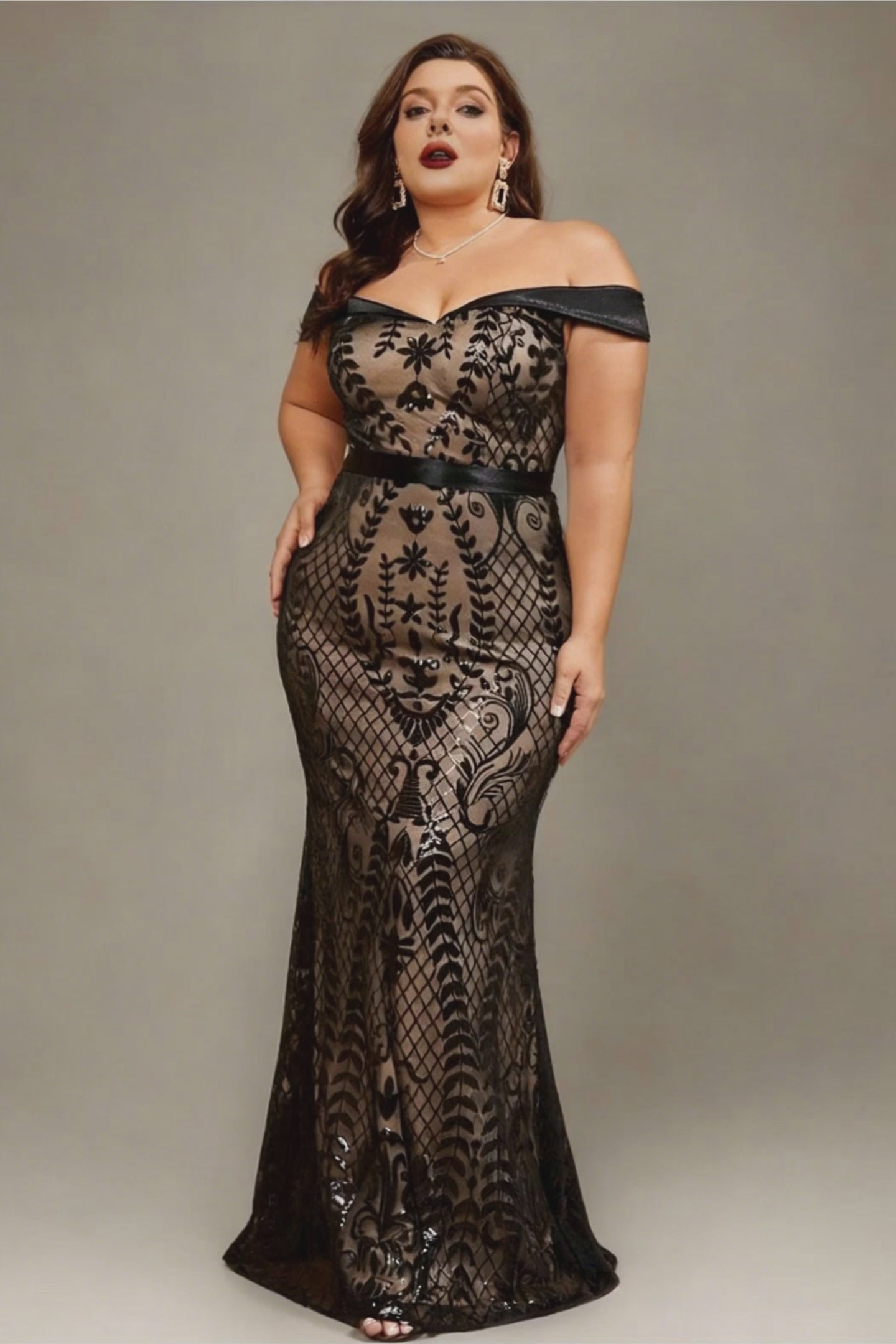 Make a stunning entrance in this plus size off-shoulder mermaid maxi dress, featuring elegant patterned detailing and a curve-enhancing silhouette. The off-shoulder neckline adds timeless femininity while the fishtail hem creates graceful movement. Perfect for formal events, parties, or special celebrations—designed to make you feel confident and unforgettable.