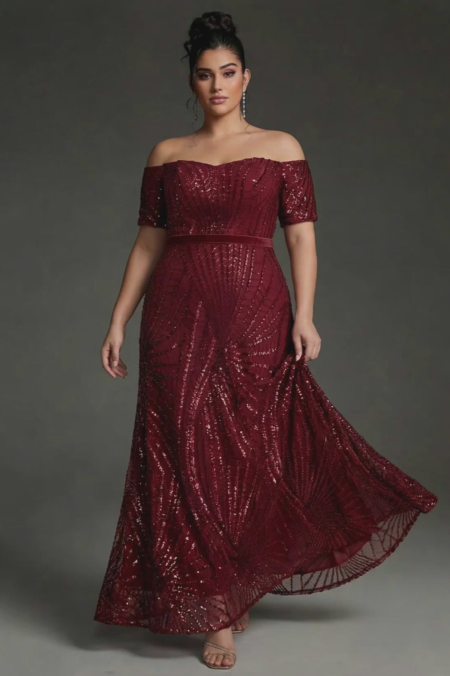 Turn heads in this plus size off-shoulder maxi dress, featuring shimmering striped sequins and a flattering waist-cinched design. The elegant neckline and figure-enhancing silhouette make it perfect for evening parties, weddings, or any glamorous occasion. Celebrate your curves with a dress that combines sparkle, sophistication, and timeless allure.