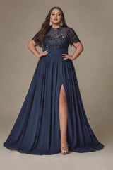 Curveins Plus Size Round Neck Embroidered Sequin-Detail Split Long Dress