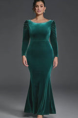 Curveins Plus Size Round Neck Long Sleeve Rhinestone Waist Bodycon Velvet Maxi Dress