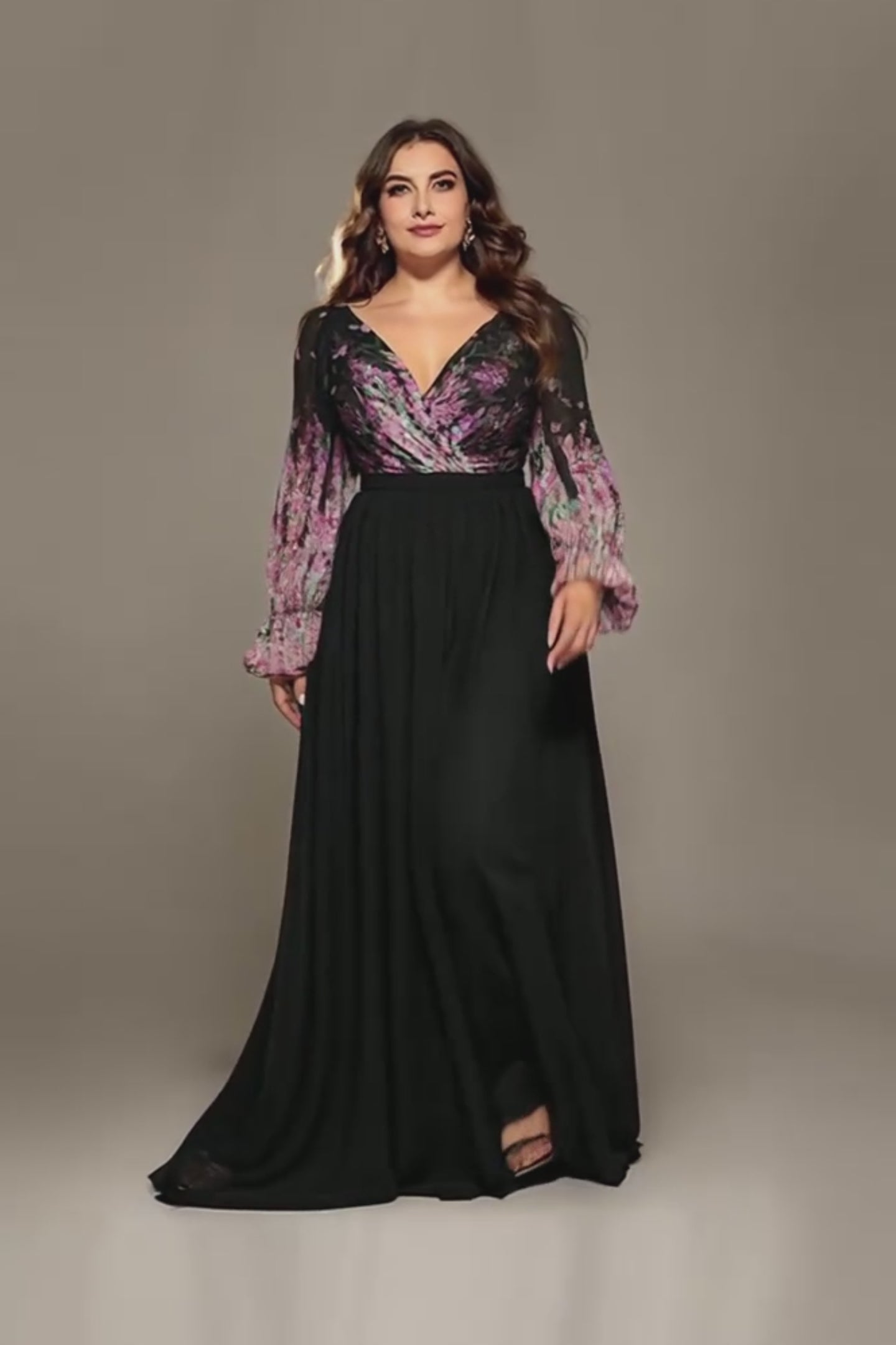 Curveins Plus Size V-Neck Floral Patchwork Maxi Dress with Flattering Flare Sleeves