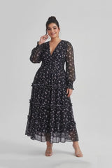 Embrace effortless elegance with this plus size floral maxi dress. Featuring a flattering V neckline, graceful long sleeves, and a flowing tiered pleated skirt, it creates beautiful movement with every step. Designed to enhance your curves while offering all-day comfort, this dress is perfect for garden parties, special occasions, or refined everyday style.