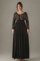 Curveins Plus Size V-Neck Long Sleeve Sequin Floral Embellished Velvet Evening Gown
