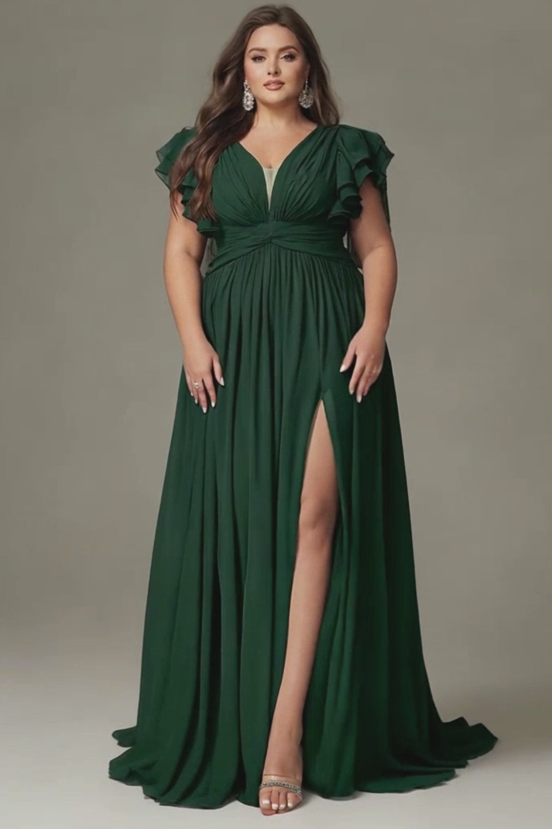 Embrace effortless elegance with this plus size V-neck A-line maxi dress. Featuring soft ruffle sleeves, a flattering waistline, and a graceful side slit, it flows beautifully with every step. Perfect for parties, dinners, or summer events, this dress combines comfort, charm, and confidence for the modern curvy woman.