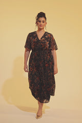 Curveins Plus Size V-Neck Sheer Batwing Sleeve Floral Velvet Midi Dress