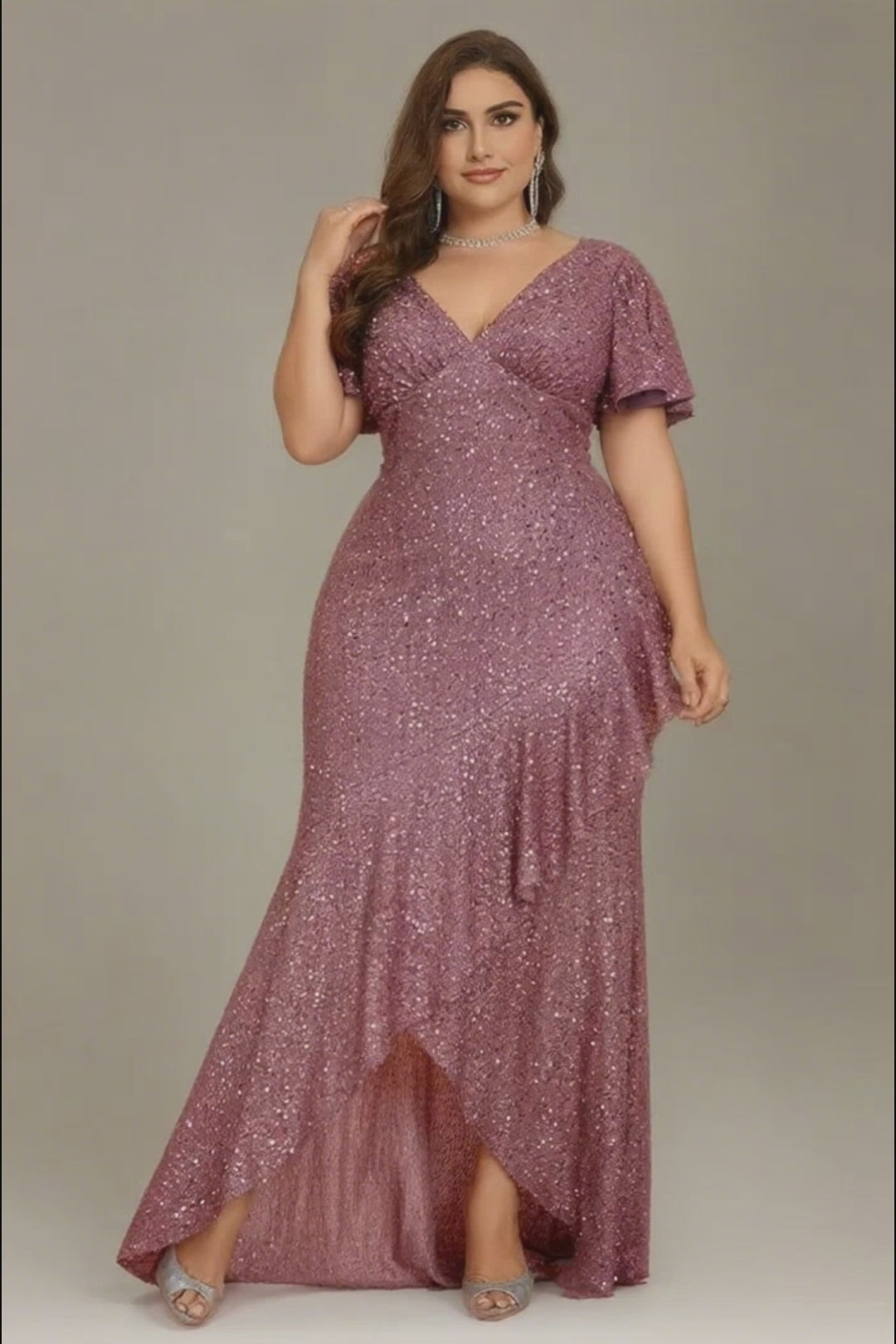 Turn heads in this stunning plus size sequin gown, featuring a flattering V-neckline, flowy flutter sleeves, and a chic side slit for added allure. The cinched waist and cascading ruffles highlight your curves with effortless glamour—perfect for evening parties, galas, or any moment you want to shine.